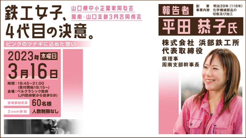 山口県中小企業家同友会2023.03.20# チラシ 中小企業経営者の方向け、経営に関する講演会の告知チラシを制作いたしました。ベルクラシック防府でのイベント開催です。Zoomでのオンライン参加も受け付けているため、背景用の画像や、待機画面用の画像などもご用意しました。納期や部数の他、WEB用画像の制作なども柔軟に対応致します。宣伝告知にお悩みでしたら山口県の広告代理店ウィルプランにご相談ください。 チラシイメージ 待機画面画像 Zoom背景用画像 山口県中小企業家同友会 http://yamaguchi.doyu.jp/