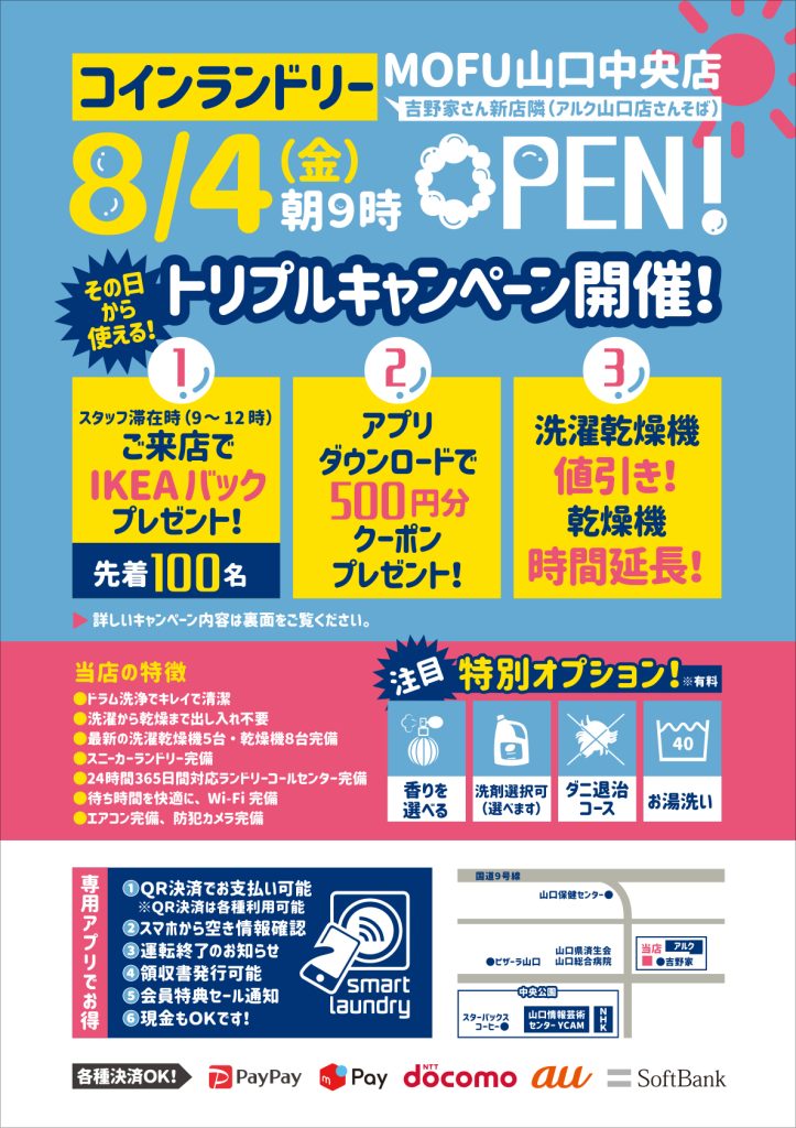 コインランドリー MOFU山口中央店2023.08.04# チラシ 8月4日にオープン予定のコインランドリーである、MOFU山口中央店様の販促チラシを制作いたしました。キャンペーンや価格帯など、重要な情報をコンパクトに詰めつつ、カラフルでにぎやかな印象のチラシになりました。チラシの制作をお考えでしたら、山口県の制作会社ウィルプランにご相談ください。 コインランドリー MOFU山口中央店 〒753-0074 山口県山口市中央4丁目6−7 https://murakami929.jp