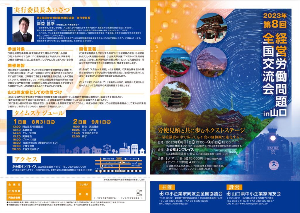 中小企業家同友会全国協議会2023.08.04# パンフレット 中小企業家同友会全国協議会が主催する、2023経営労働問題全国交流会の紹介パンフレットを制作いたしました。山口県での開催であることをアピールするため多くの写真を用いつつも、オレンジと青のツートーンの色構成にし、ポップでありつつも落ち着いた印象のパンフレットに仕上げました。パンフレットの制作をお考えでしたら、是非ウィルプランにご相談ください。 中小企業家同友会全国協議会 https://www.doyu.jp/