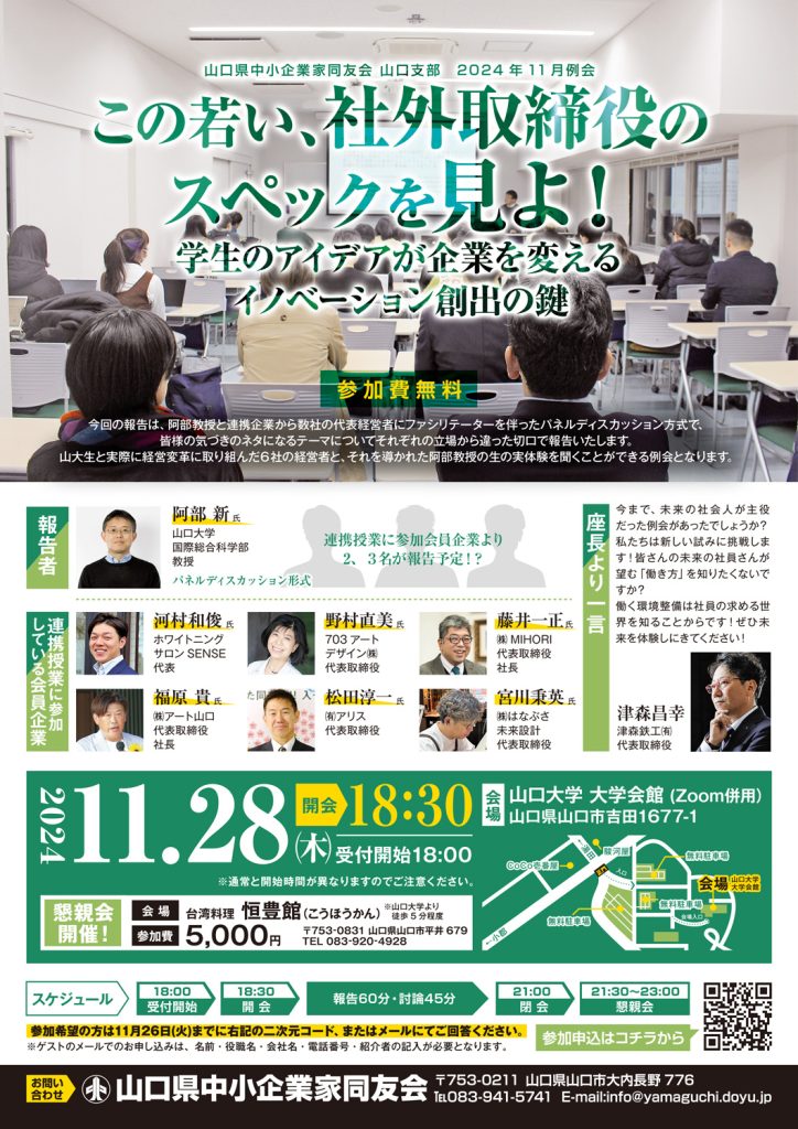 山口県中小企業家同友会 2024年11月チラシ2024.11.01# チラシ 中小企業経営者の方向け、経営に関する講演会の2024年11月例会告知チラシを制作いたしました。 報告者の写真をメインにしたこれまでのチラシとは異なり、この度はパネルディスカッション方式ということで1人にフォーカスするのではなく参加型ならではの会場内の空気感を大切にしています。 目的やターゲットに合わせた広報物の制作など、柔軟に対応致します。宣伝告知にお悩みでしたら山口県の広告代理店ウィルプランにご相談ください。 山口県中小企業家同友会 http://yamaguchi.doyu.jp/
