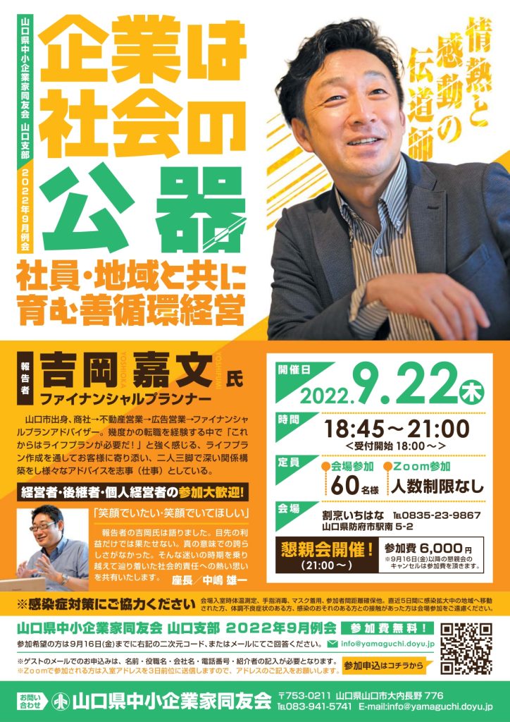山口県中小企業家同友会2022.09.15# チラシ 山口県中小企業家同友会山口支部 9月例会チラシ 山口県で活躍する経営者・後継者・個人経営者の方へ、定例会への参加を呼び掛けるチラシを作成いたしました。中島雄一座長のもと、ファイナンシャルプランナー 吉岡嘉文氏の報告が行われます。中小企業の皆様、チラシ作成でお困りでしたら、山口県の制作会社ウィルプランにご相談ください。 山口県中小企業家同友会 http://yamaguchi.doyu.jp/